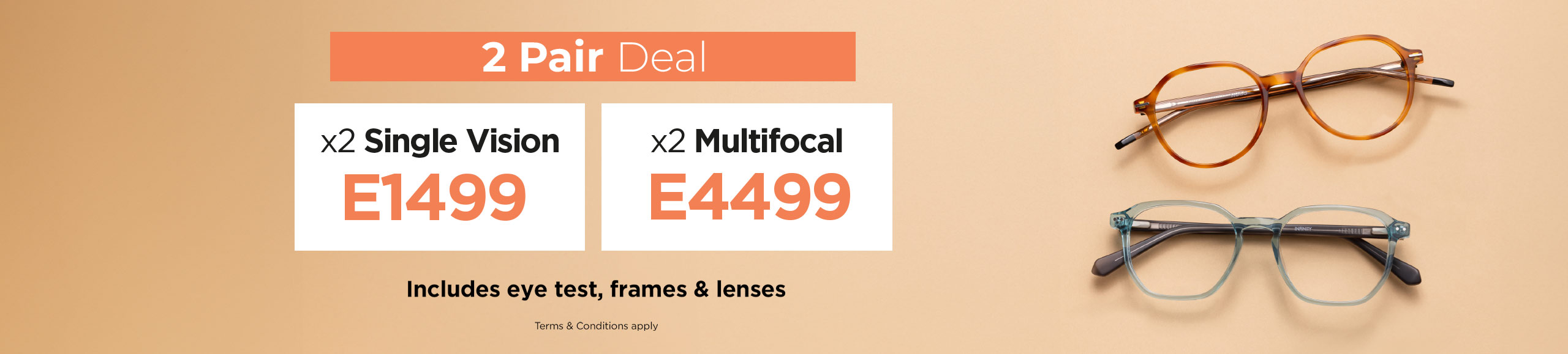 Buy a complete pair of single vision spectacles plus an eye examination and you get your 2nd pair of single vision spectacles for free!